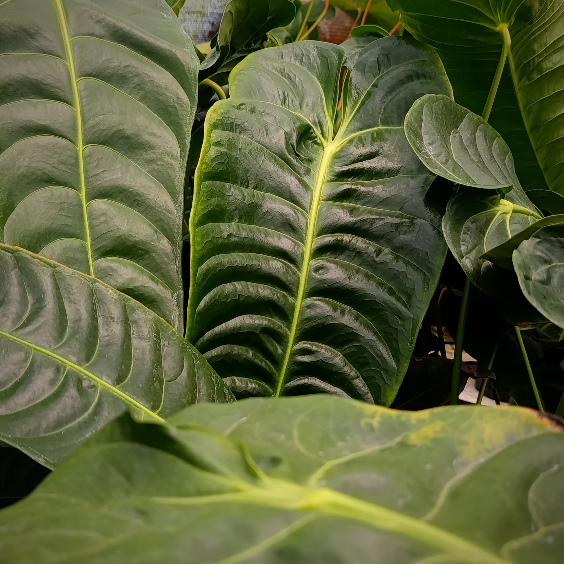 El Anturio veitchii, conocido también como “Rey Anturio”, es una de las especies más imponentes dentro del género Anthurium. Se distingue por sus hojas alargadas, gruesas y profundamente corrugadas, con una textura acanalada muy marcada que le da un aspecto escultórico y exótico. A medida que madura, sus hojas pueden alcanzar tamaños sorprendentes, convirtiéndose en el centro de atención en cualquier espacio.