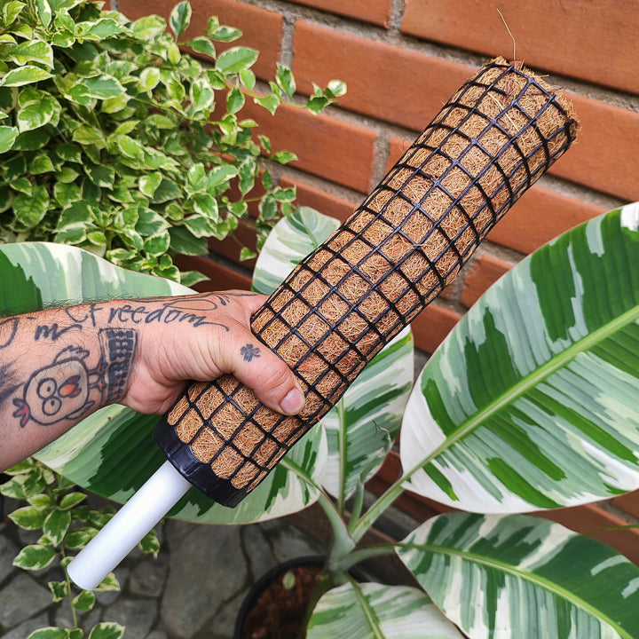 Su textura de coco no solo brinda excelente soporte, sino que también retiene la humedad: mantenlo húmedo para que las raíces aéreas se sientan cómodas y crezcan adheridas. De hecho, cuando las raíces se desarrollan dentro del tutor, este se convierte en una extensión de la maceta, lo que significa que no necesitas una maceta tan grande como creías.